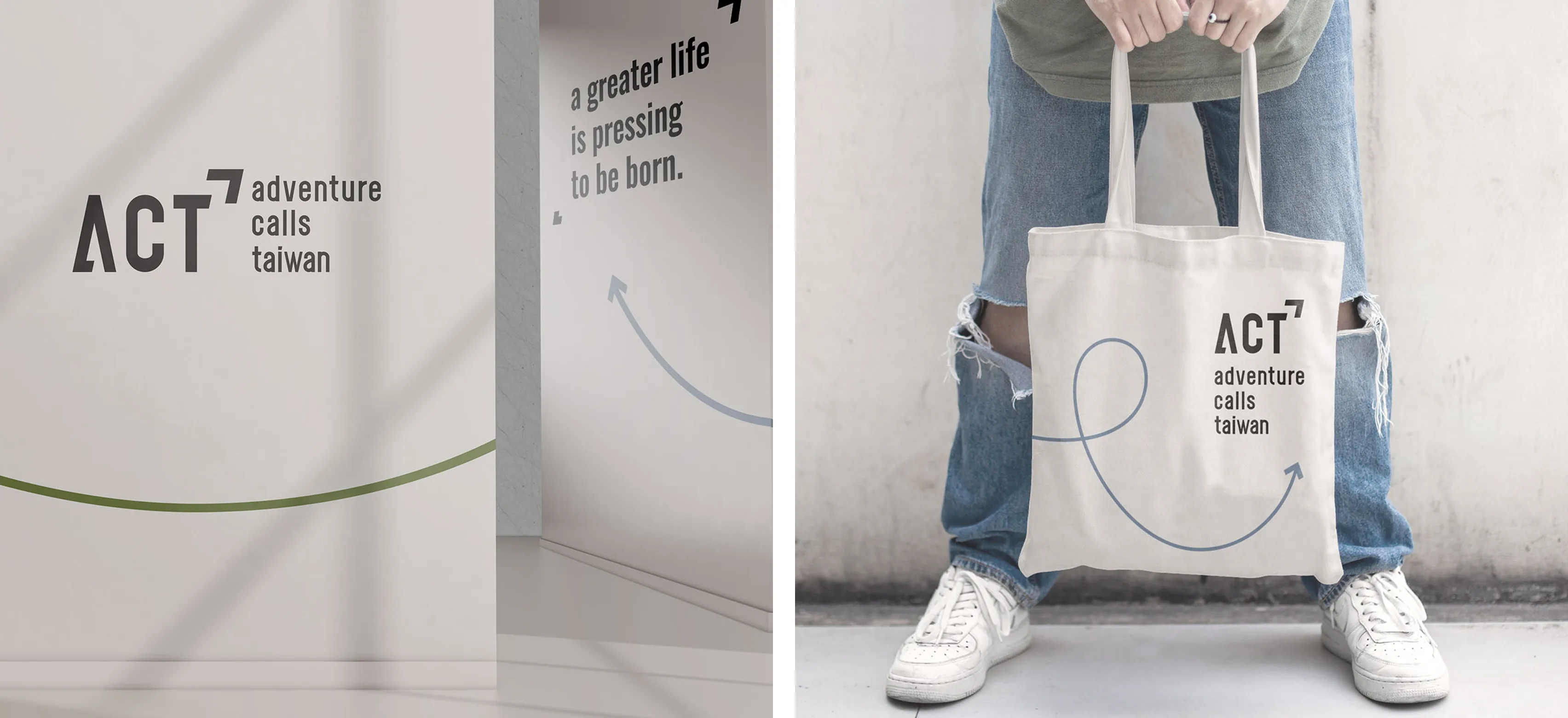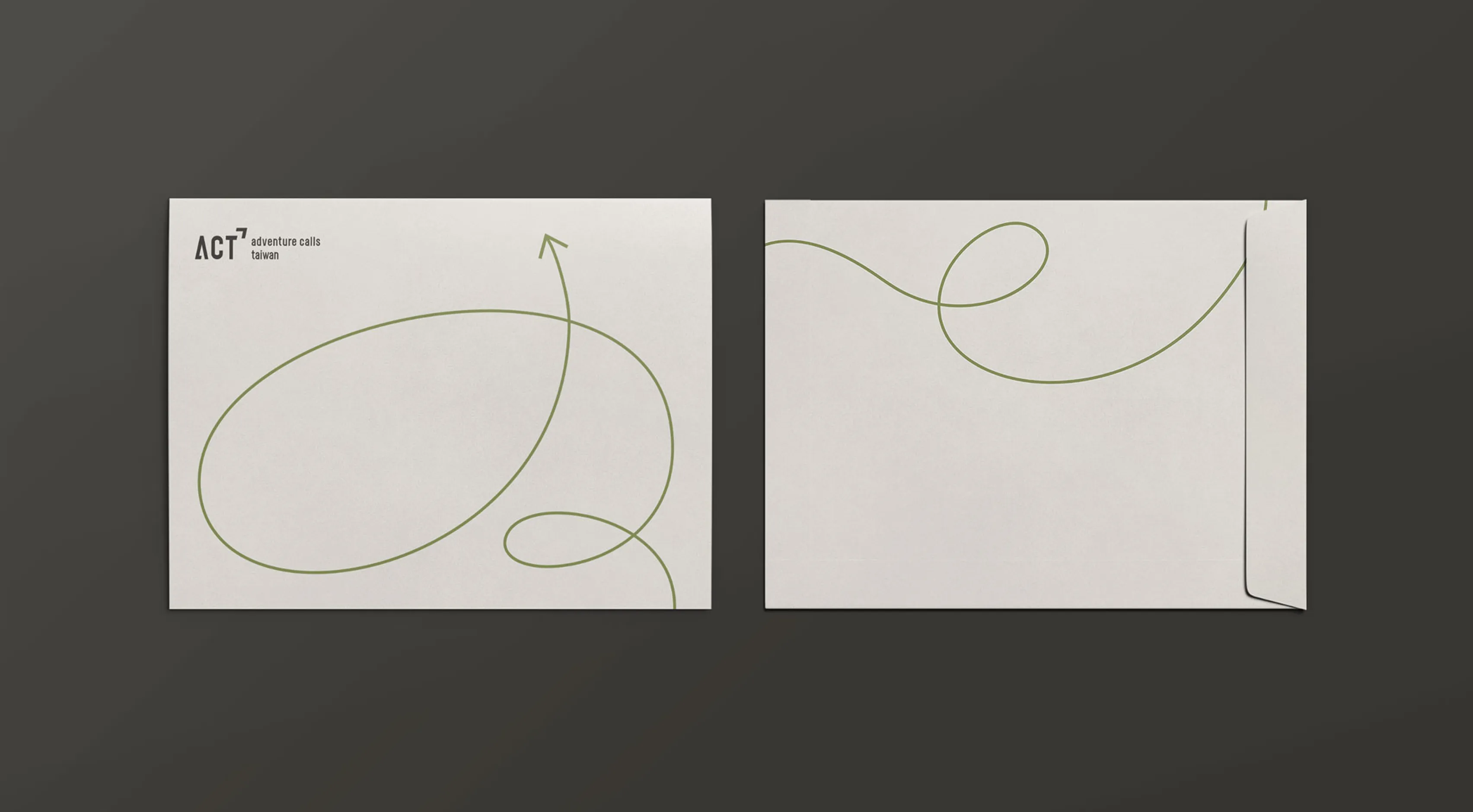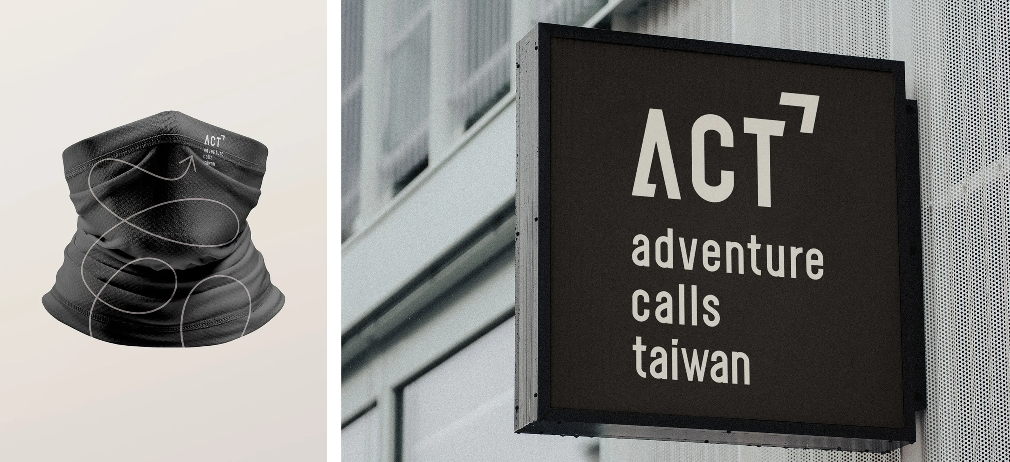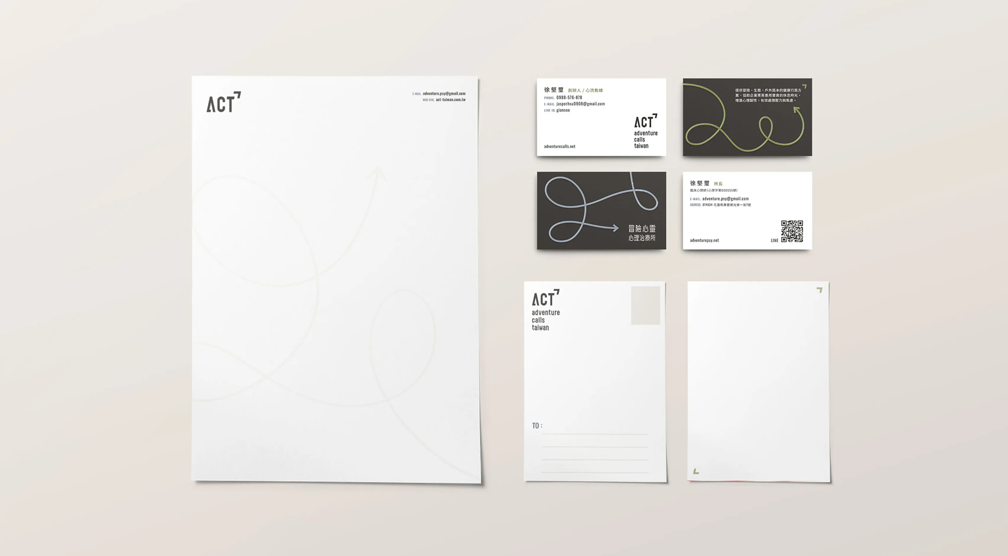 最終,我們提交了一套完整的品牌基礎規範 (Brand Basic Guideline) 。此系統中最具辨識度的資產,是一個貫穿整體的「品牌輔助圖案」—— 代表「歷程」與「自由」的動態線條。這條柔順且帶有方向性的線條,成為串連雙品牌的視覺靈魂,靈活應用於名片、信封、A4卷宗夾、頭巾乃至招牌 等各式媒材。色彩上,我們選用沉穩的深灰搭配中性的草綠與大地色系,成功地在「專業」與「冒險」之間取得完美平衡,使品牌形象高度統一且易於識別。